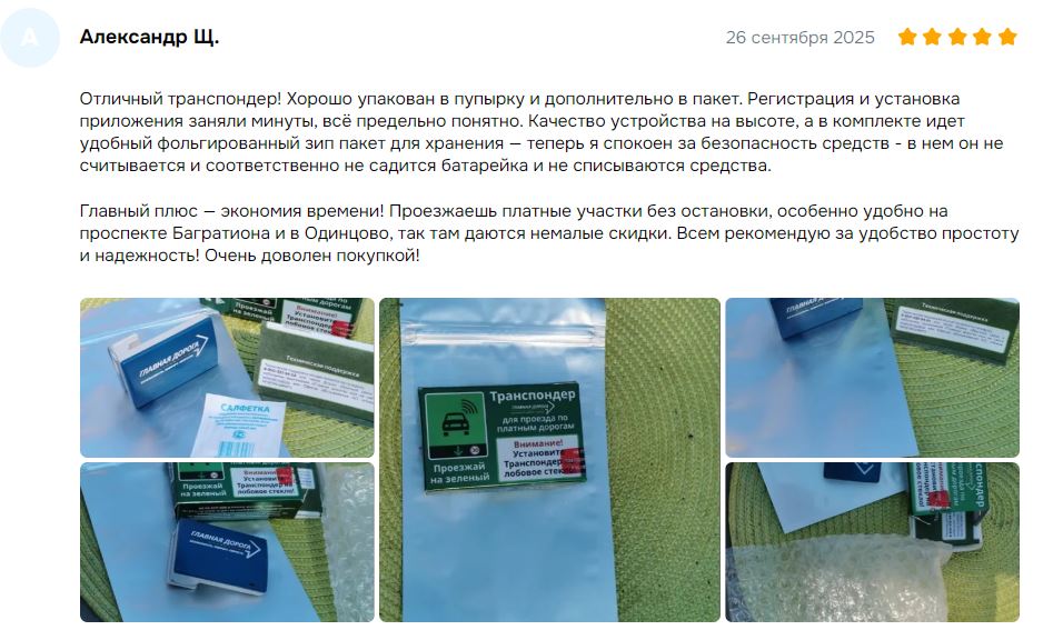 Отличный транспондер! Хорошо упакован в пупырку и дополнительно в пакет. Регистрация и установка приложения заняли минуты, всё предельно понятно. Качество устройства на высоте, а в комплекте идет удобный фольгированный зип пакет для хранения — теперь я спокоен за безопасность средств - в нем он не считывается и соответственно не садится батарейка и не списываются средства. Главный плюс — экономия времени! Проезжаешь платные участки без остановки, особенно удобно на проспекте Багратиона и в Одинцово, так там даются немалые скидки. Всем рекомендую за удобство простоту и надежность! Очень доволен покупкой!