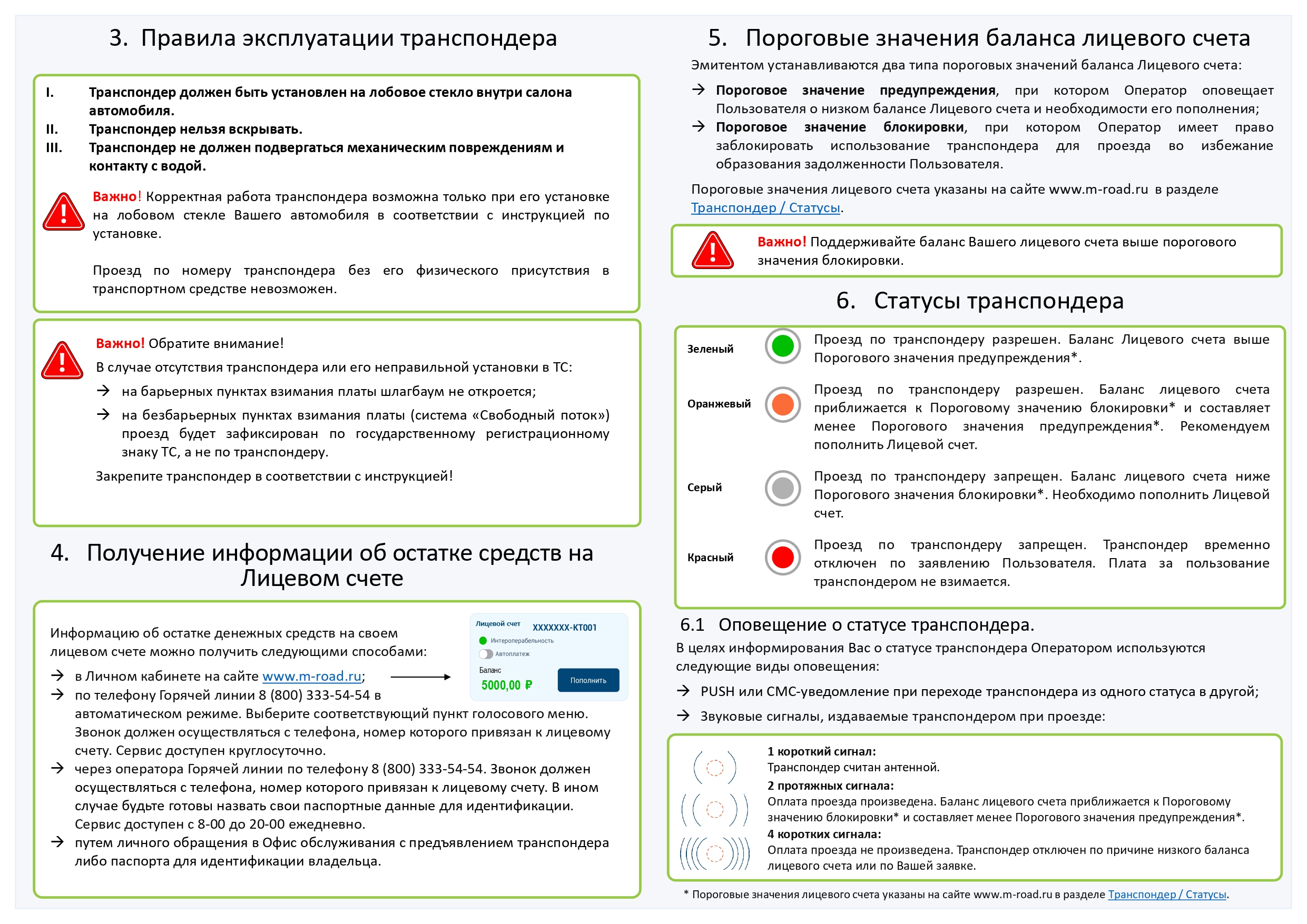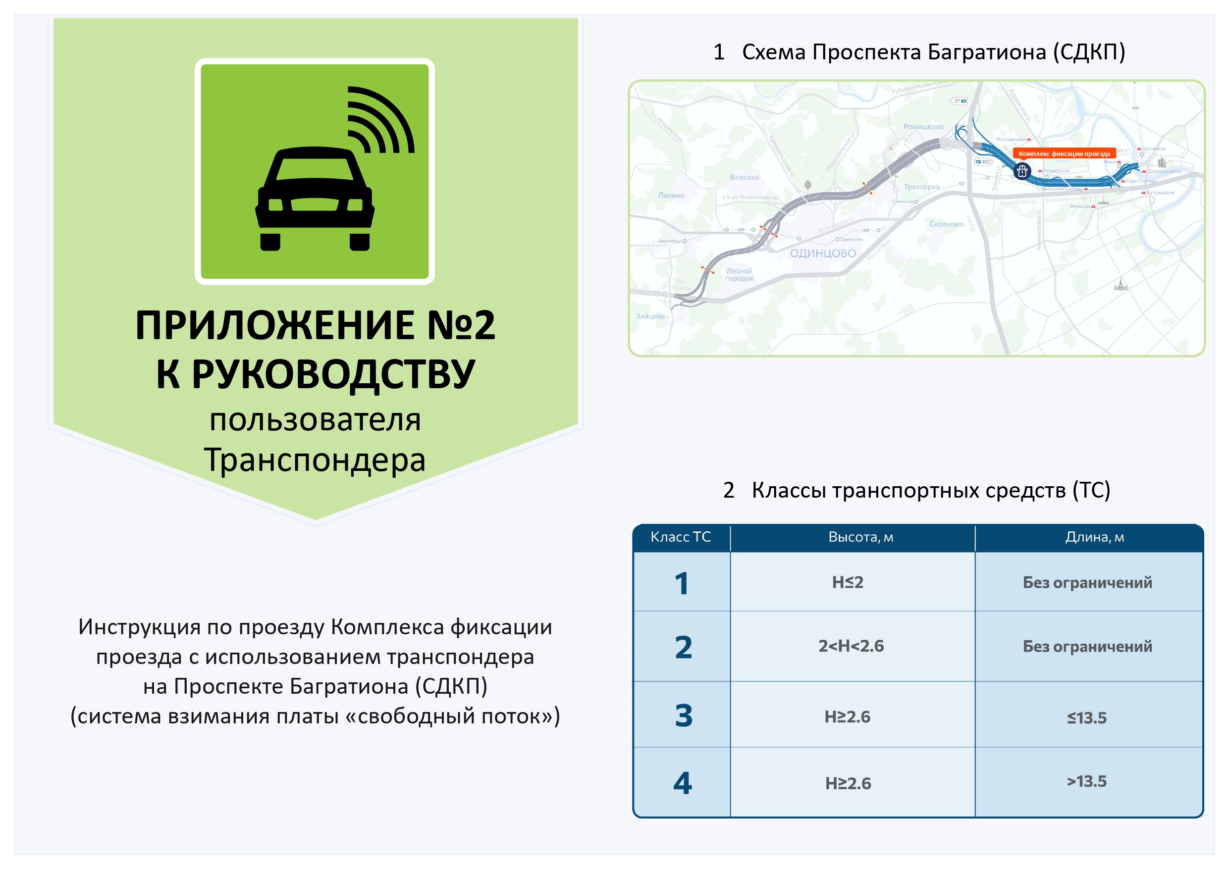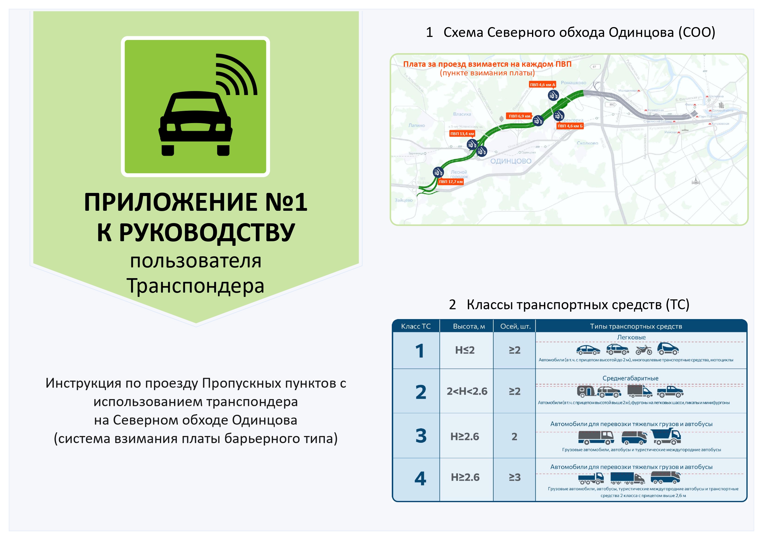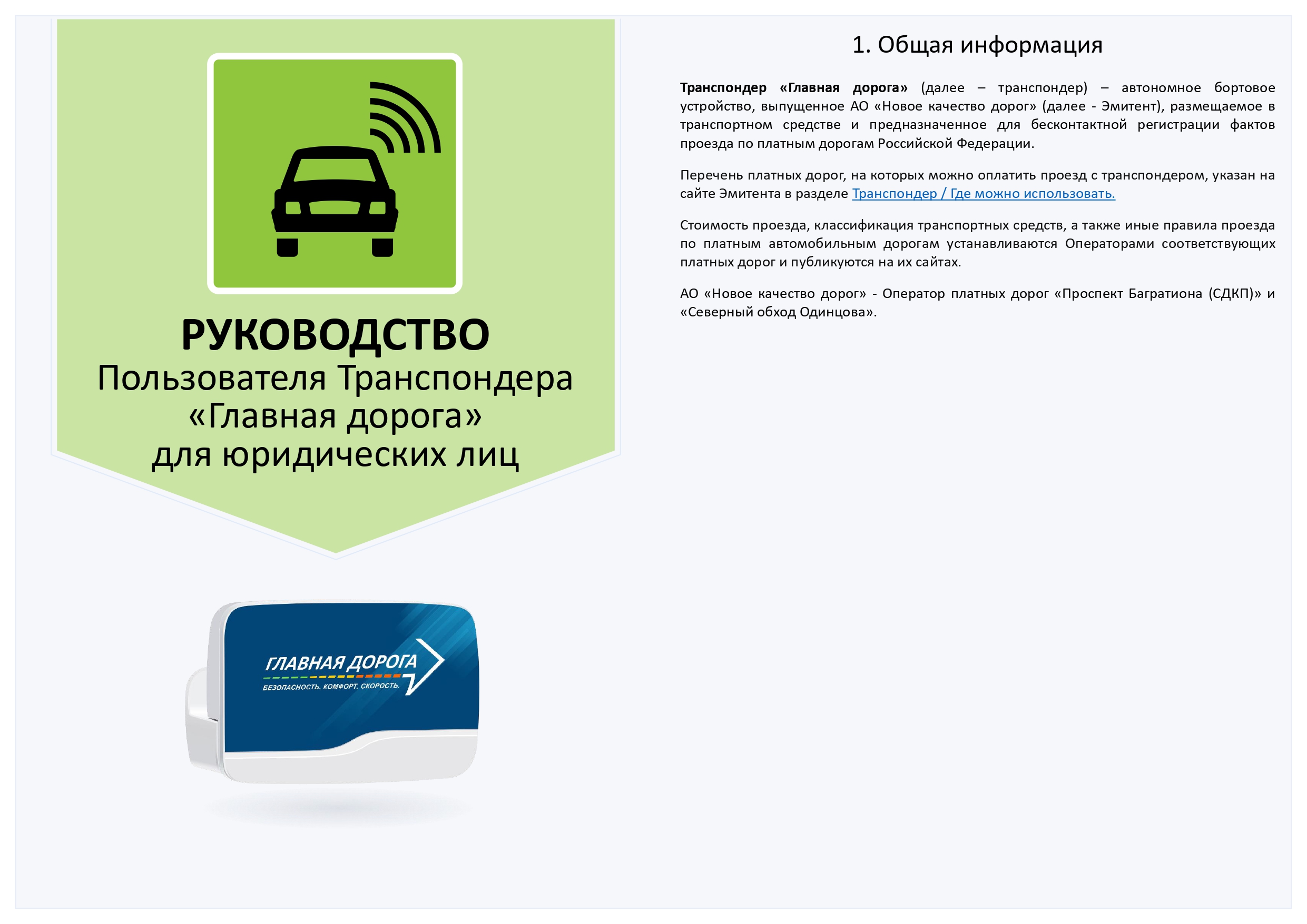 Транспондер «Главная дорога» (далее – транспондер) – автономное бортовое устройство, выпущенное АО «Новое качество дорог» (далее - Эмитент), размещаемое в транспортном средстве и предназначенное для бесконтактной регистрации фактов проезда по платным дорогам Российской Федерации. Перечень платных дорог, на которых можно оплатить проезд с транспондером, указан на сайте Эмитента в разделе Транспондер / Где можно использовать. Стоимость проезда, классификация транспортных средств, а также иные правила проезда по платным автомобильным дорогам устанавливаются Операторами соответствующих платных дорог и публикуются на их сайтах. АО «Новое качество дорог» - Оператор платных дорог «Проспект Багратиона (СДКП)» и «Северный обход Одинцова».