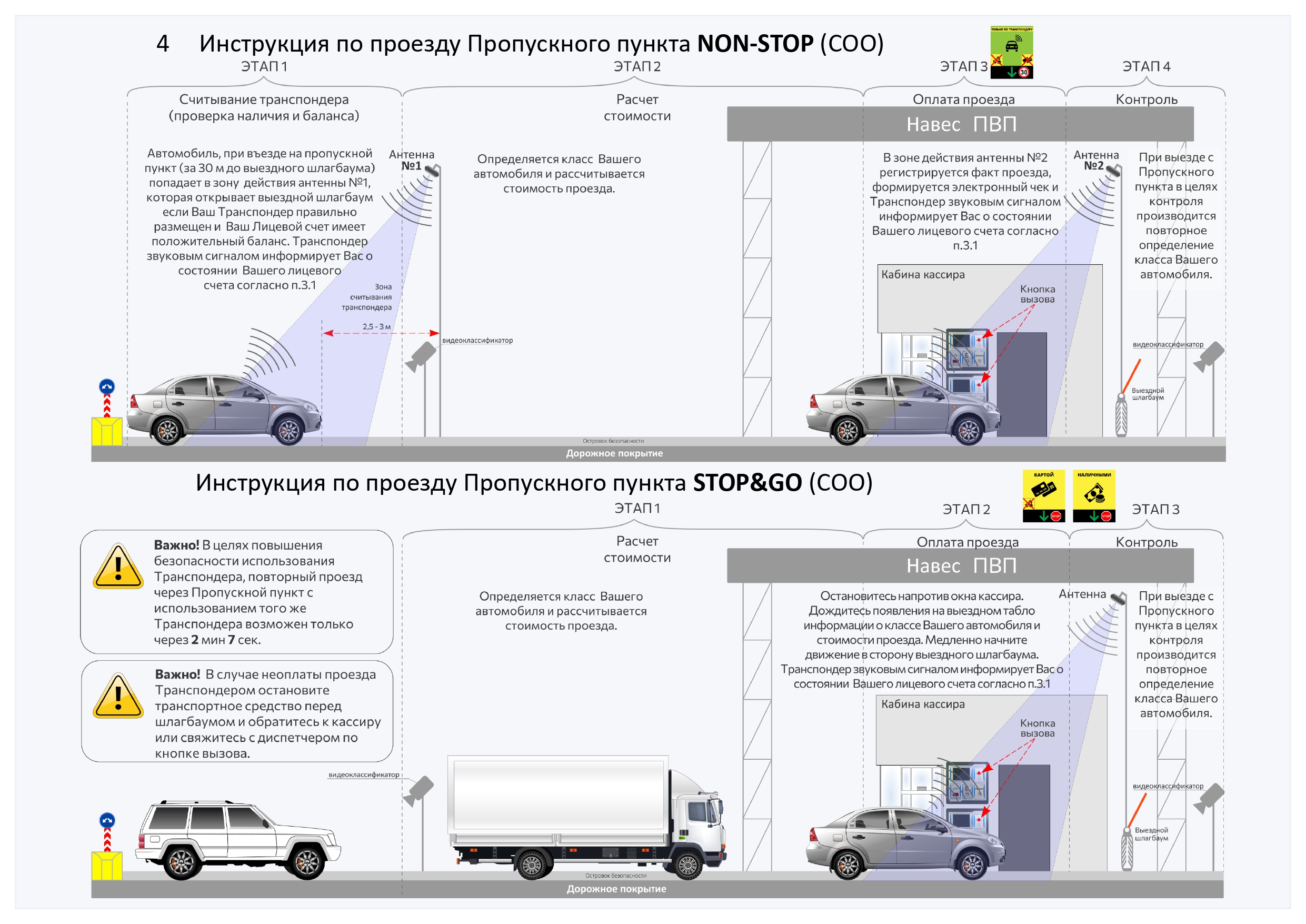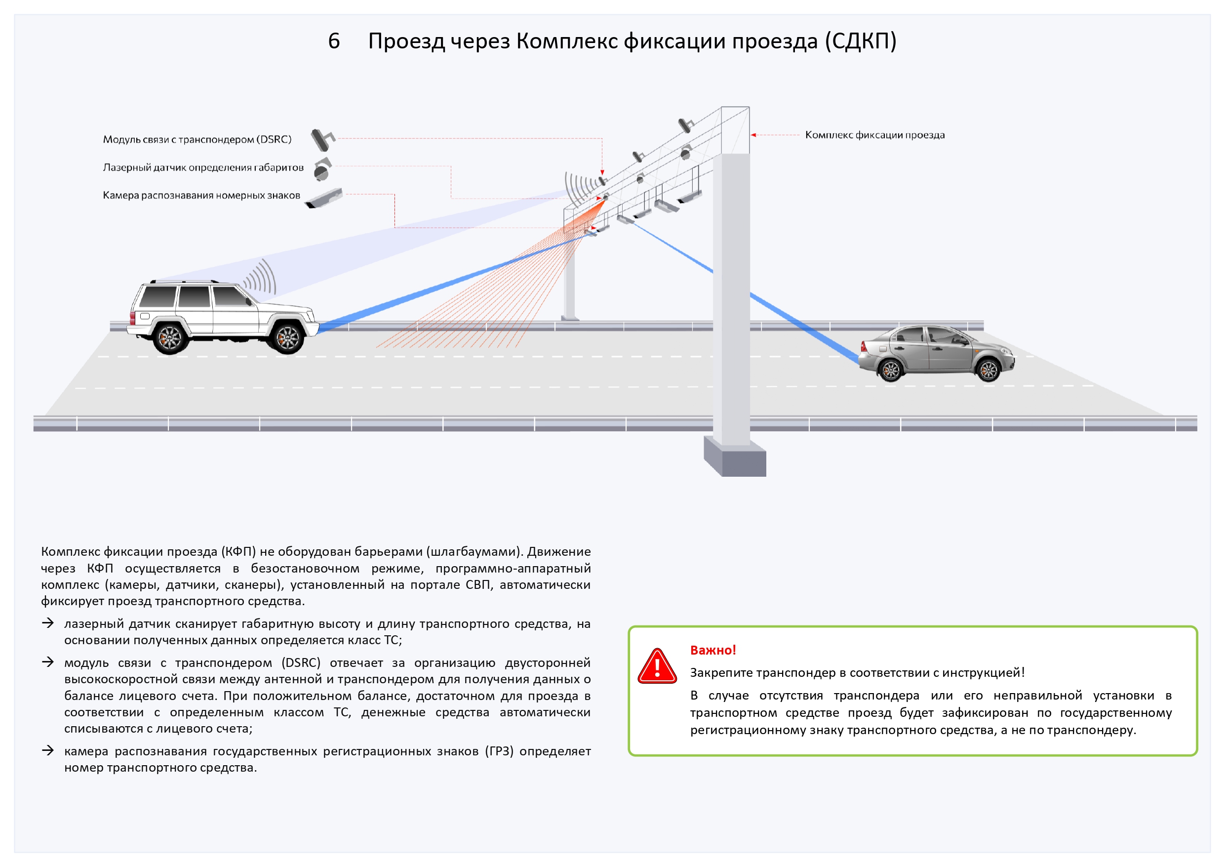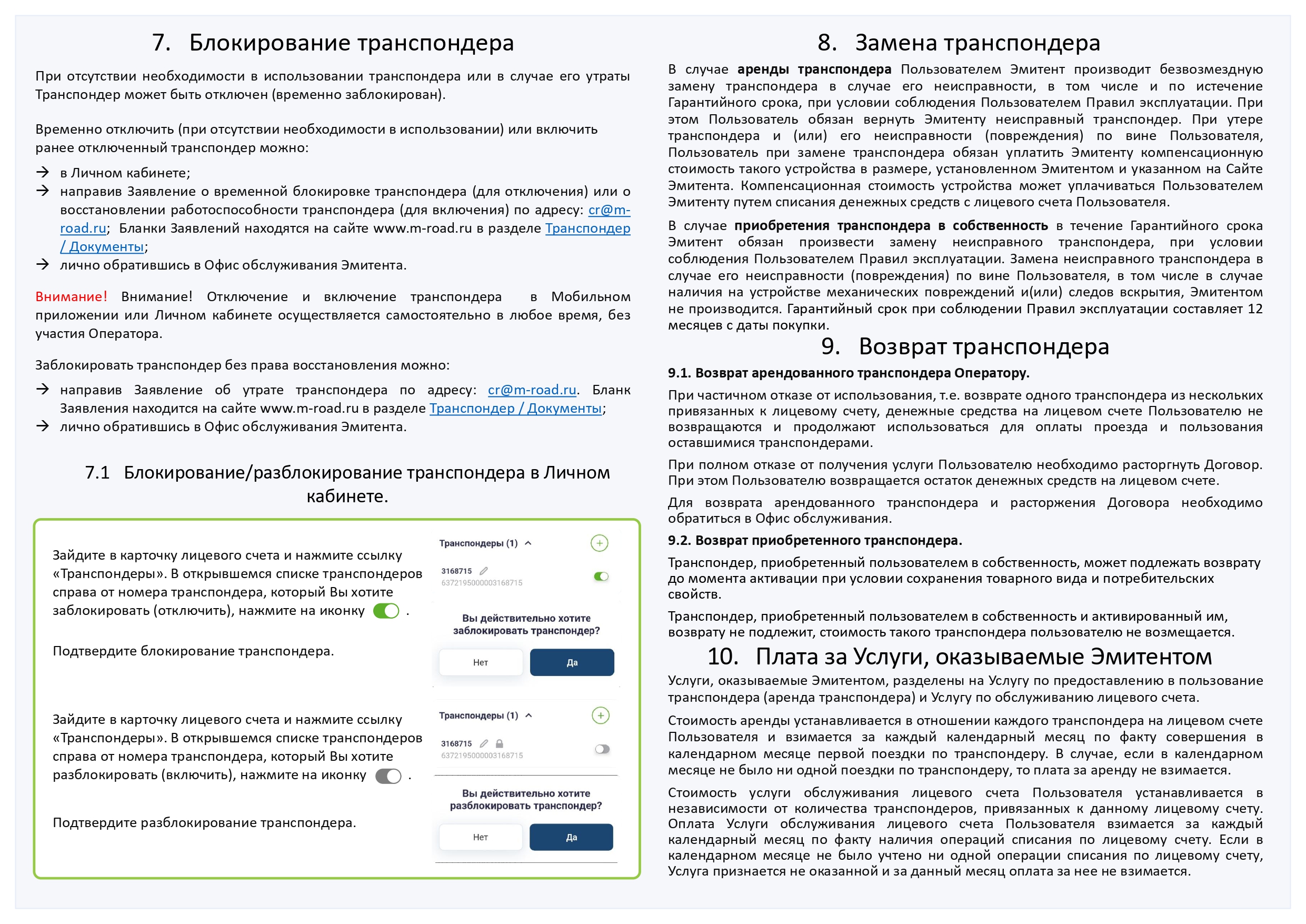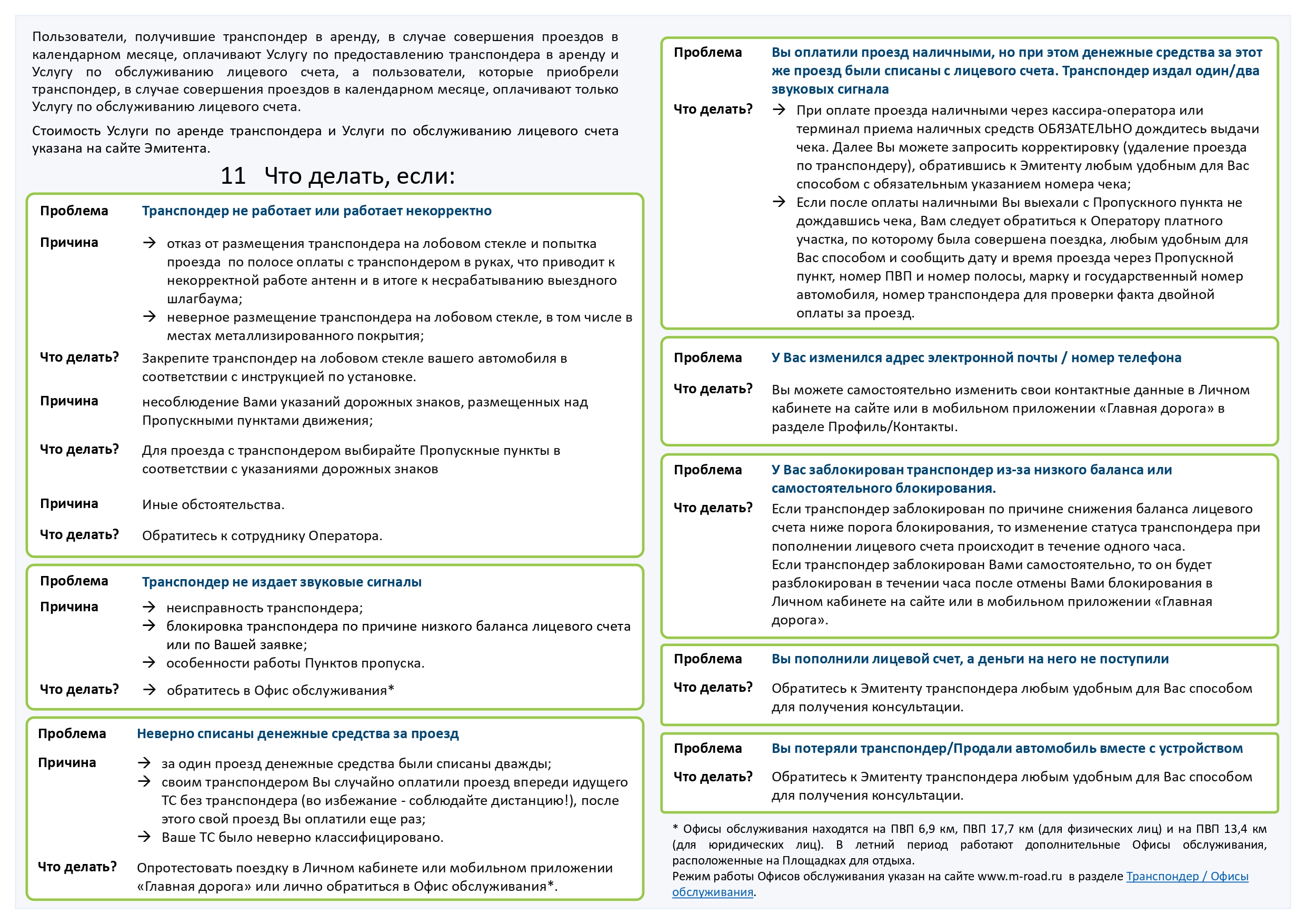 Транспондер «Главная дорога» (далее – транспондер) – автономное бортовое устройство, выпущенное АО «Новое качество дорог» (далее - Эмитент), размещаемое в транспортном средстве и предназначенное для бесконтактной регистрации фактов проезда по платным дорогам Российской Федерации. Перечень платных дорог, на которых можно оплатить проезд с транспондером, указан на сайте Эмитента в разделе Транспондер / Где можно использовать. Стоимость проезда, классификация транспортных средств, а также иные правила проезда по платным автомобильным дорогам устанавливаются Операторами соответствующих платных дорог и публикуются на их сайтах. АО «Новое качество дорог» - Оператор платных дорог «Проспект Багратиона (СДКП)» и «Северный обход Одинцова».